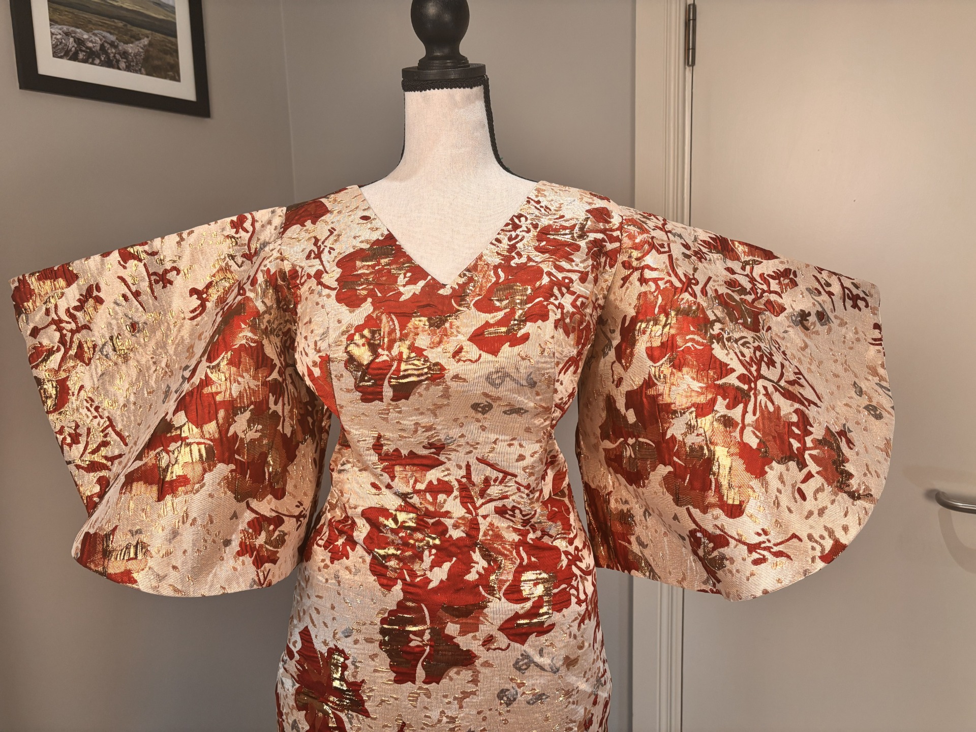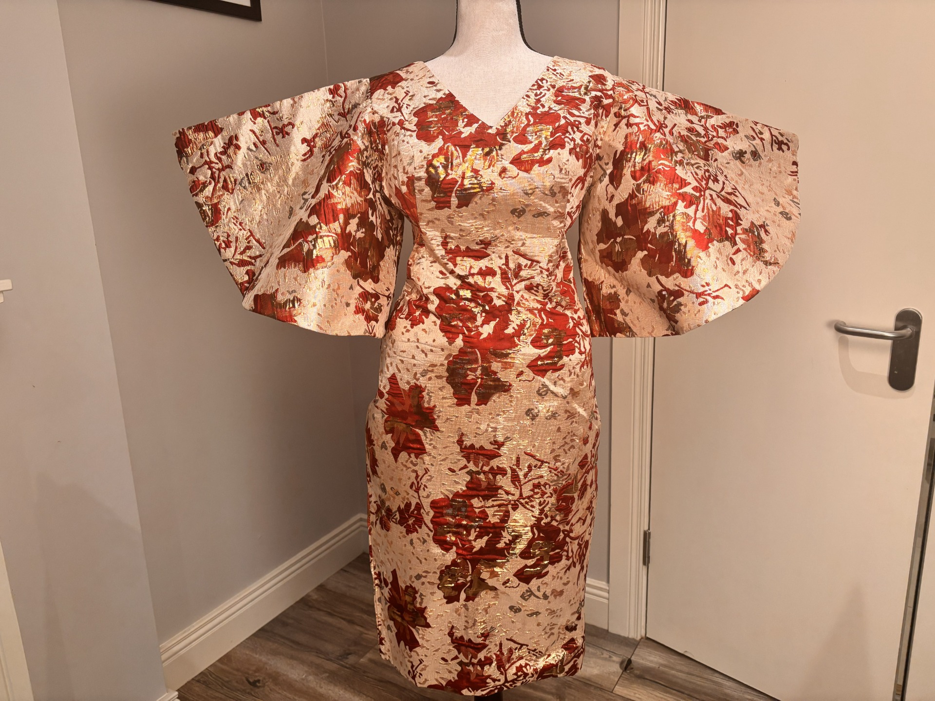 Sophisticated and feminine, this floral jacquard midi dress features dramatic butterfly sleeves and a beautifully tailored silhouette. Perfect for weddings, special events, and elegant occasions.
