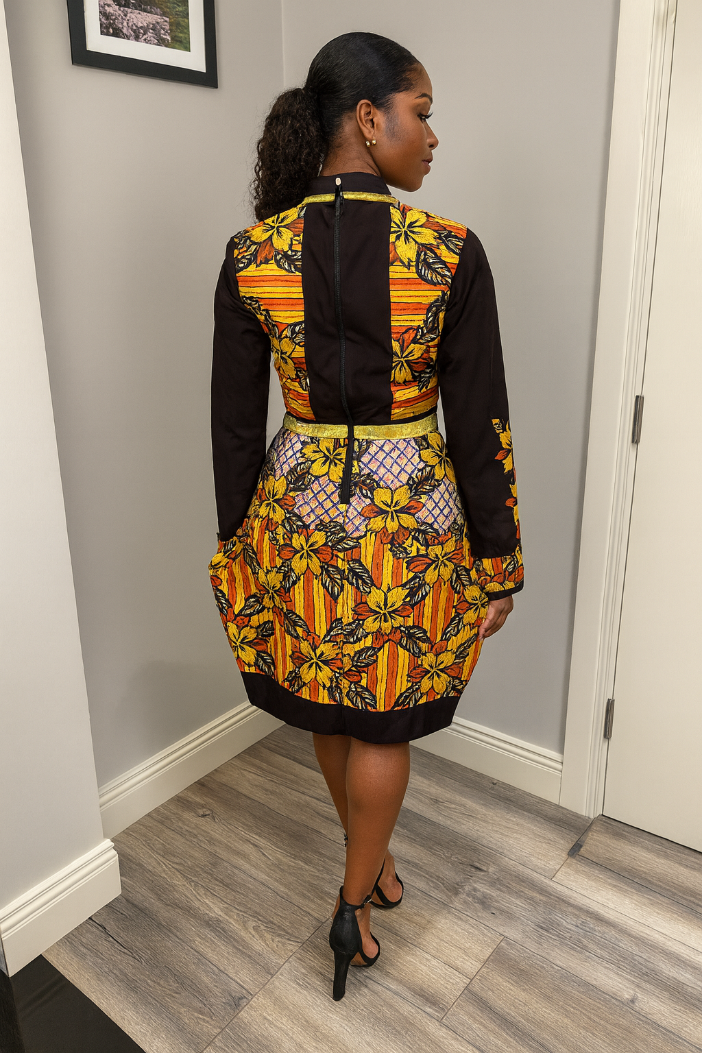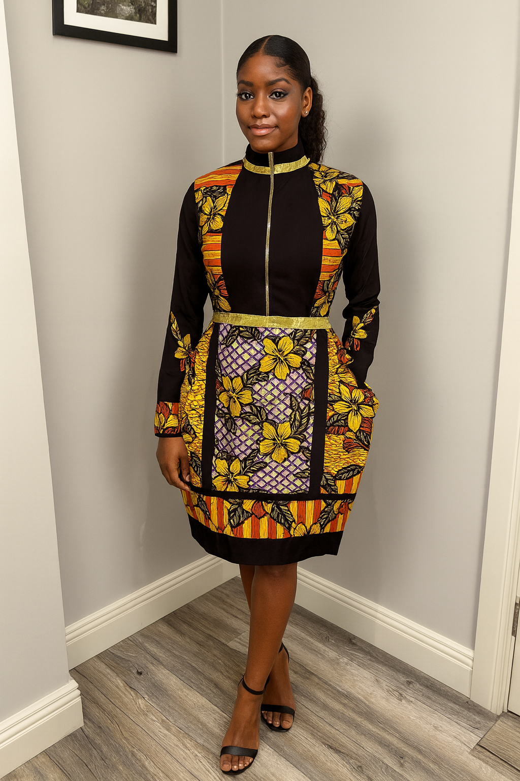 A chic Ankara dress featuring bold floral prints, a sleek zip-front neckline, and a flattering tailored fit—perfect for standout elegance.