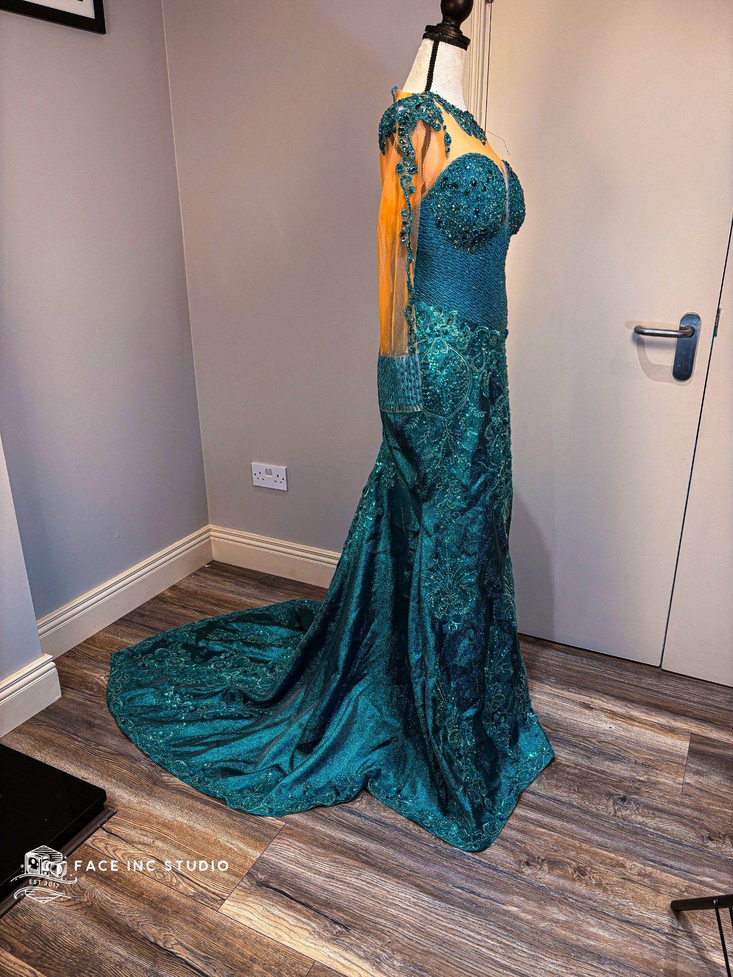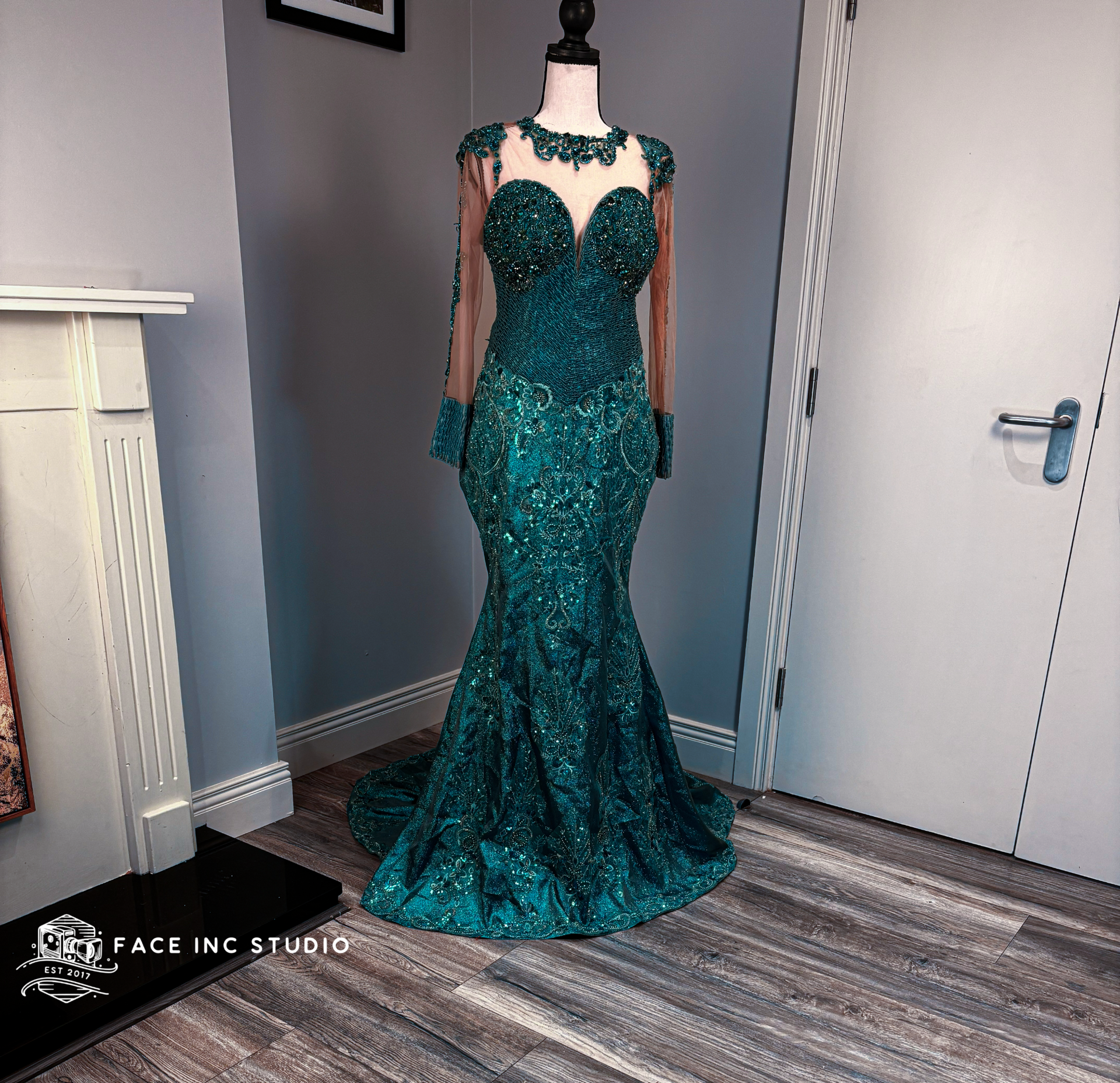 This Face afrikana G and B Luxury Long dress is hand beaded with face custom fabricated lace making it unique and a master piece. Watch here