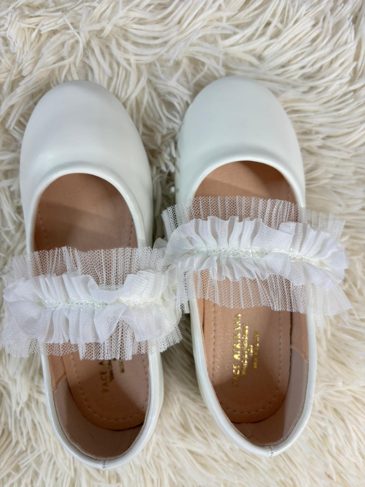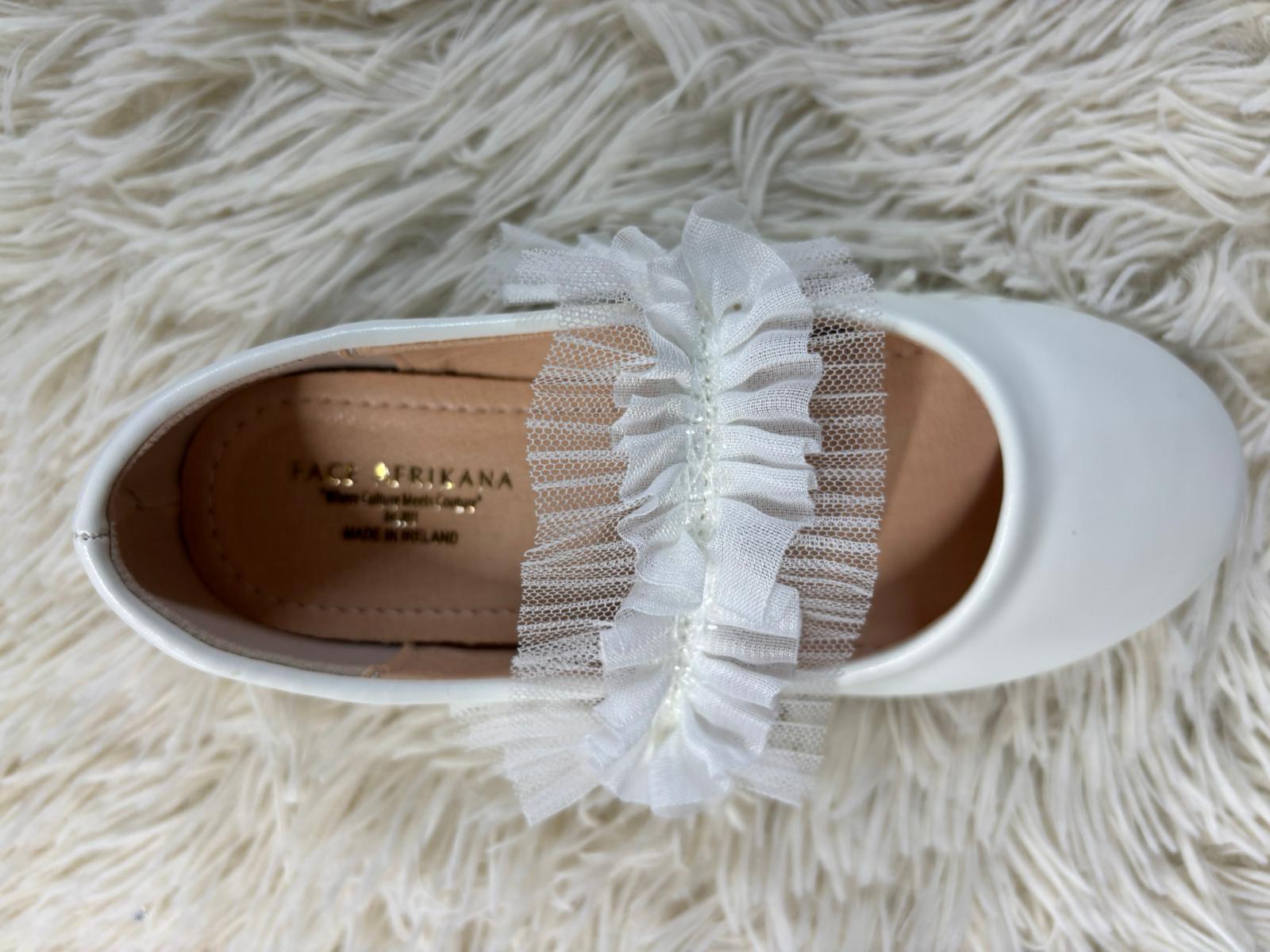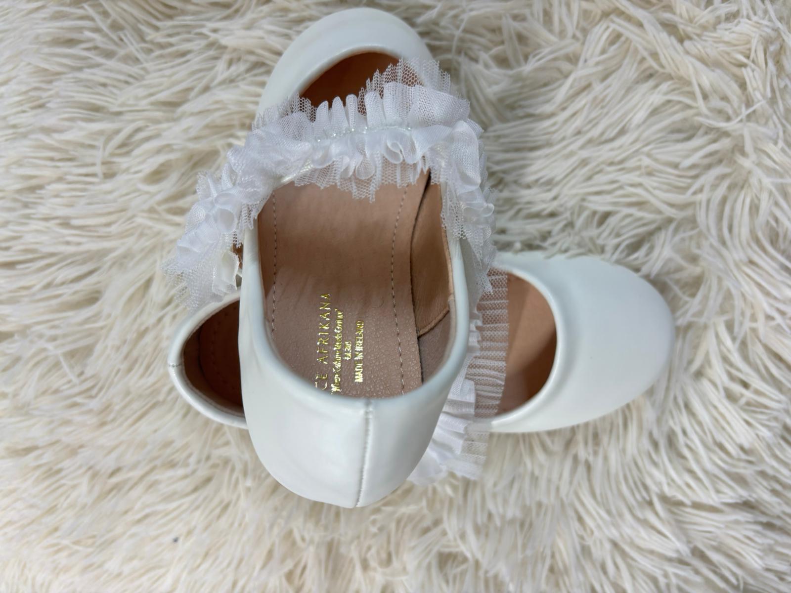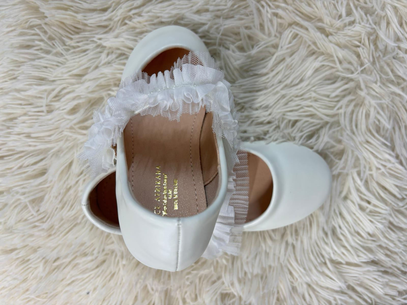 Elegant ivory flats featuring a delicate tulle ruffle strap for a soft, romantic touch. Designed with a cushioned insole for all-day comfort, they are perfect for weddings, parties, and graceful everyday wear.