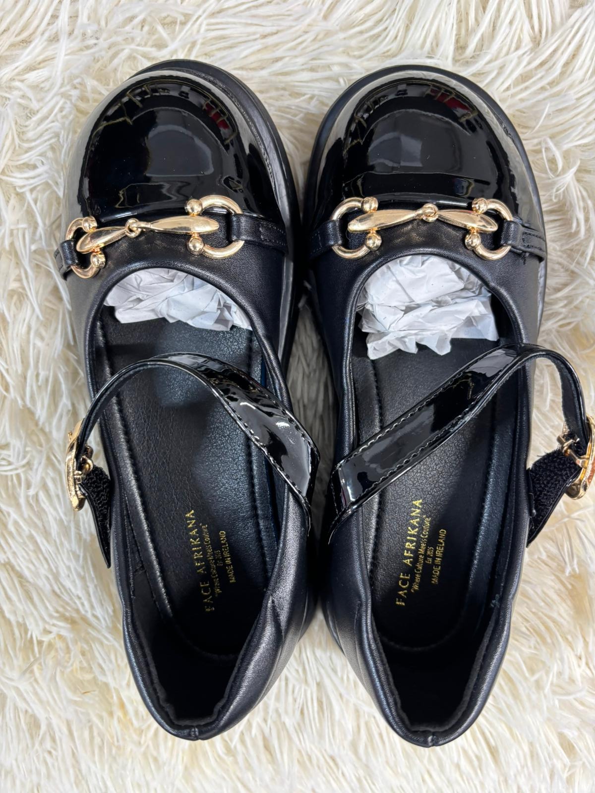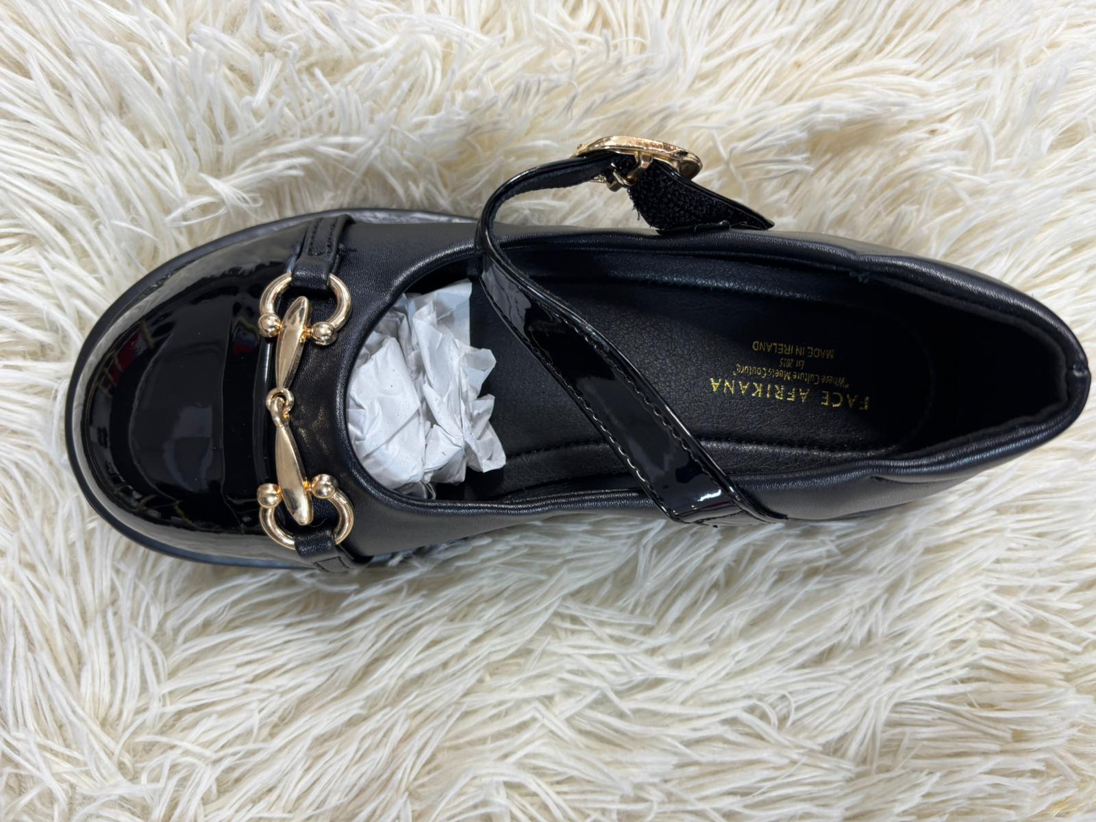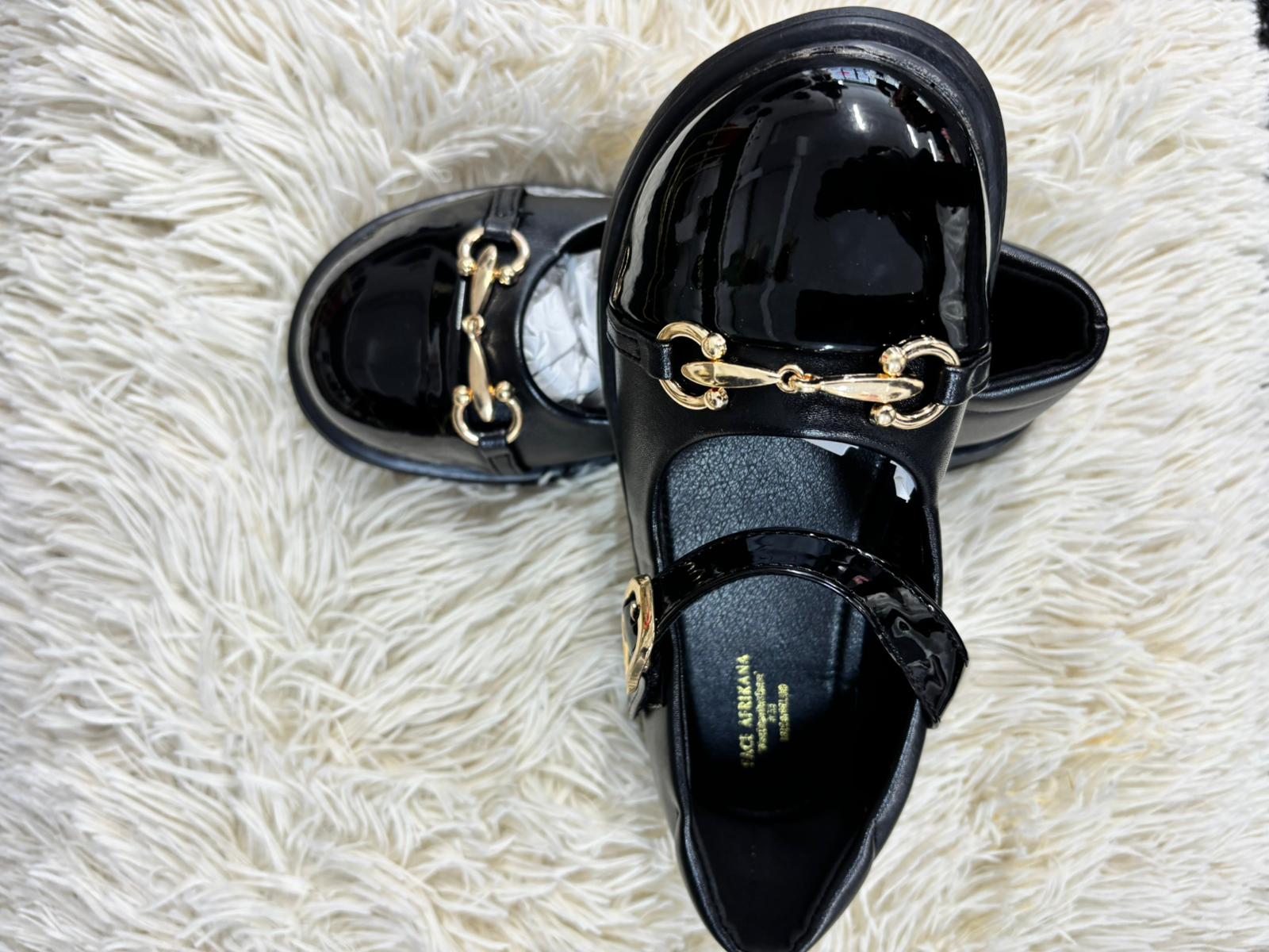 Sophisticated black patent flats featuring a sleek gold chain detail across the front for a polished, designer-inspired look. Finished with a secure strap and cushioned interior, they offer both comfort and elegance for formal occasions or elevated everyday wear.