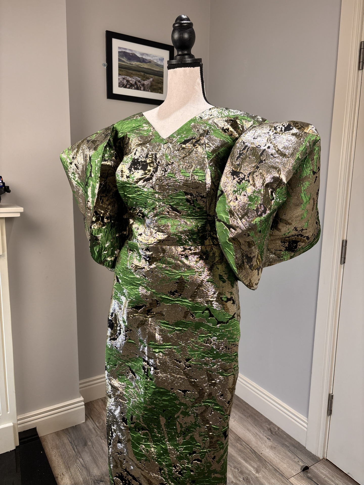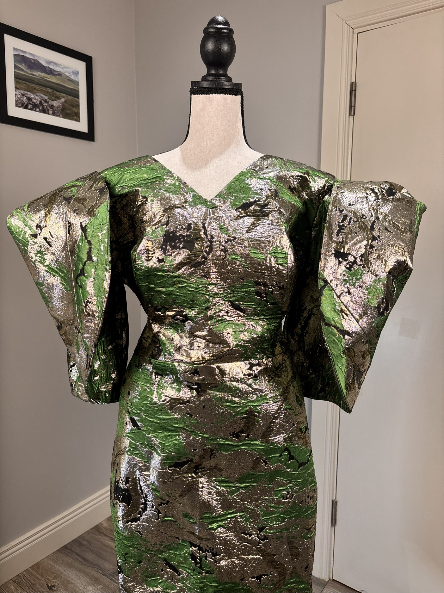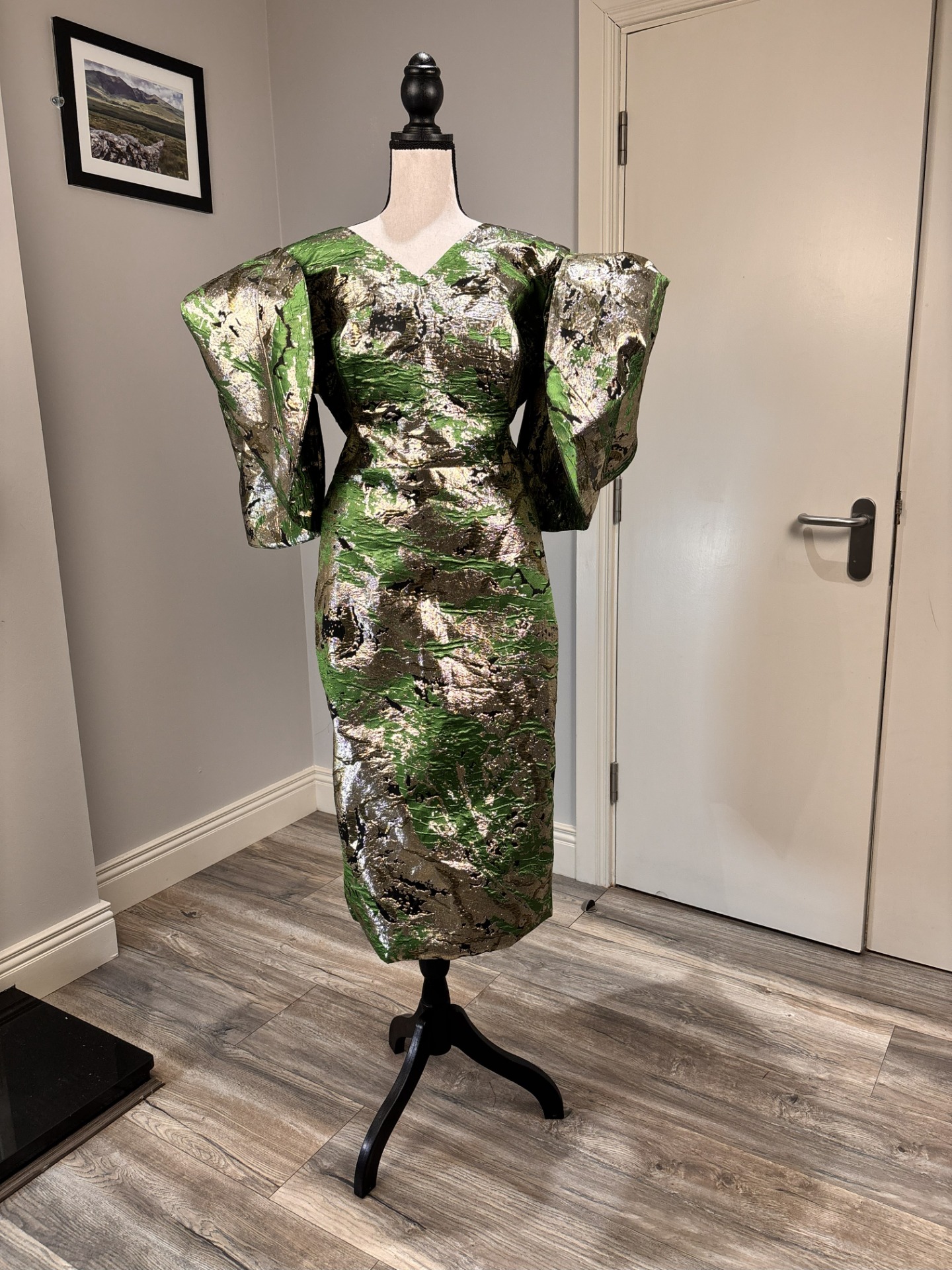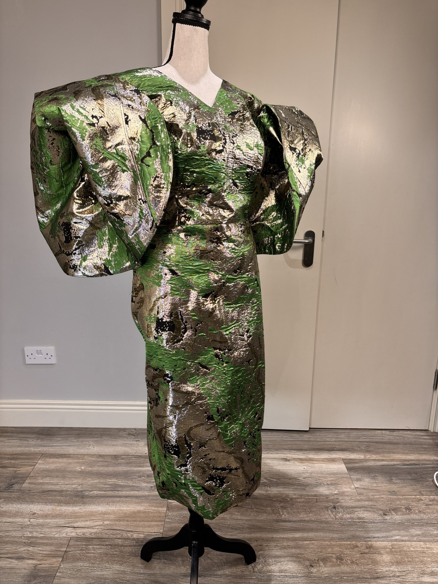 The Green Metalic Brocade Damask Midi Dress is a masterpiece of texture and silhouette