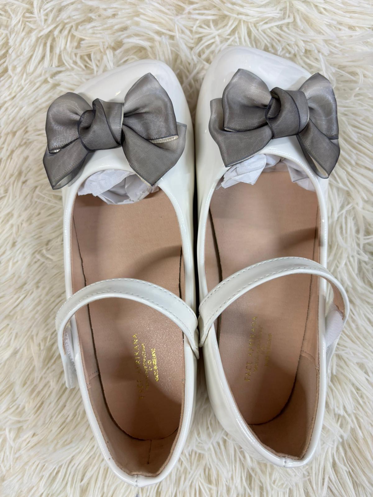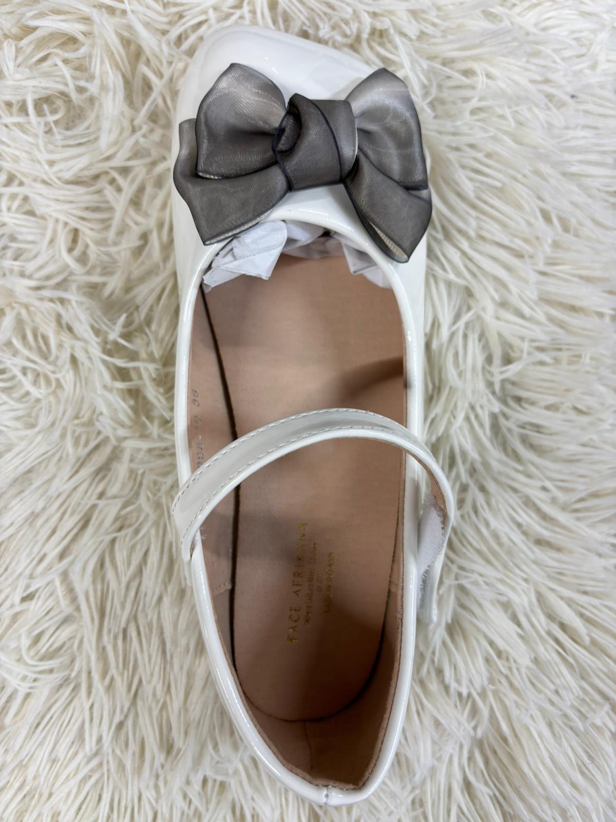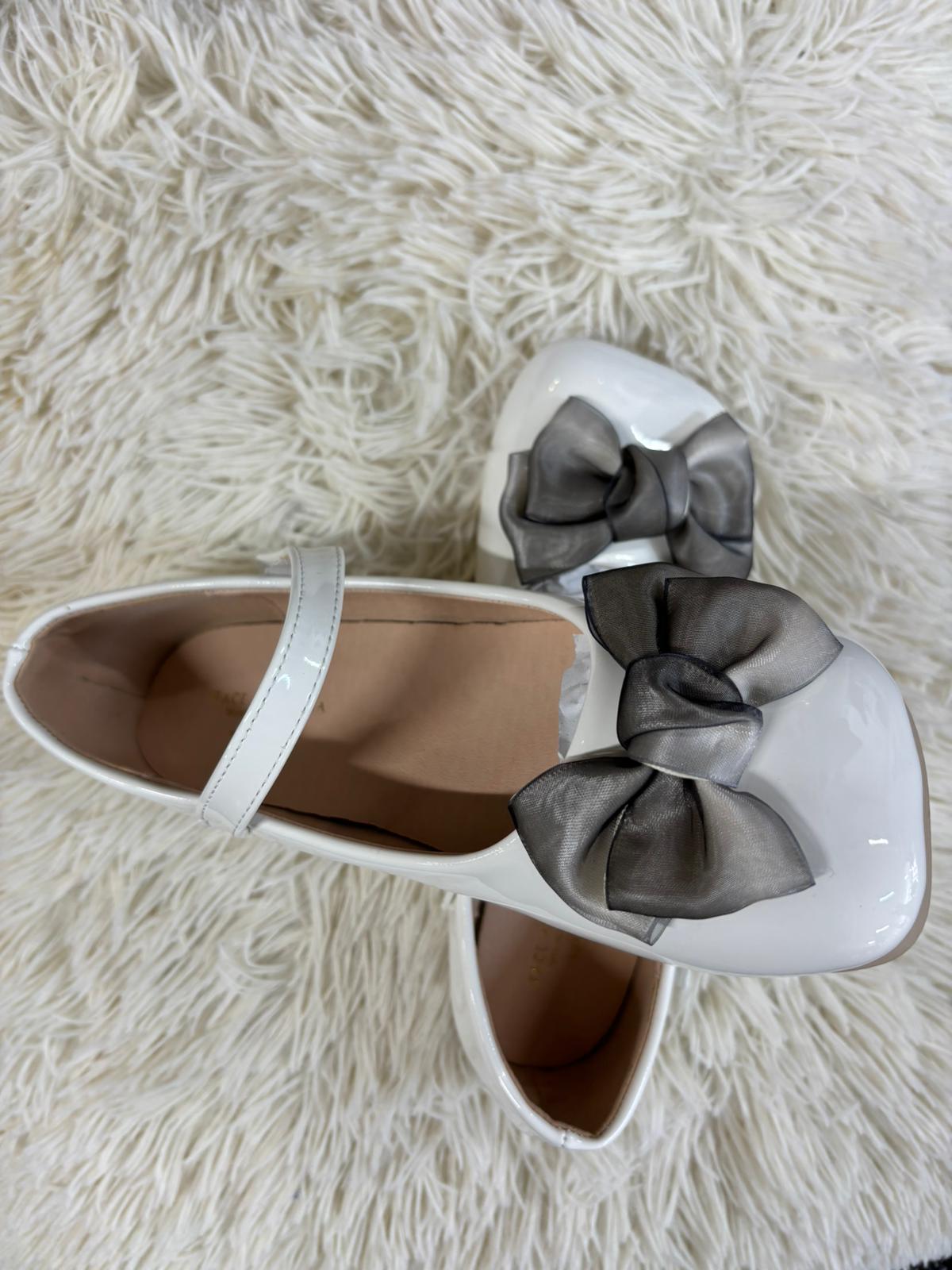 Chic white patent flats accented with a soft black organza bow for a timeless contrast. Featuring a secure strap and cushioned interior, they blend elegance and comfort—perfect for formal events or stylish everyday wear.