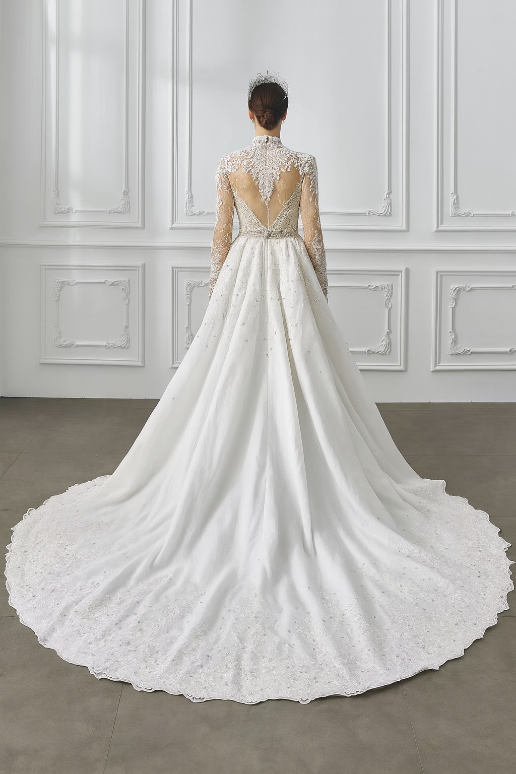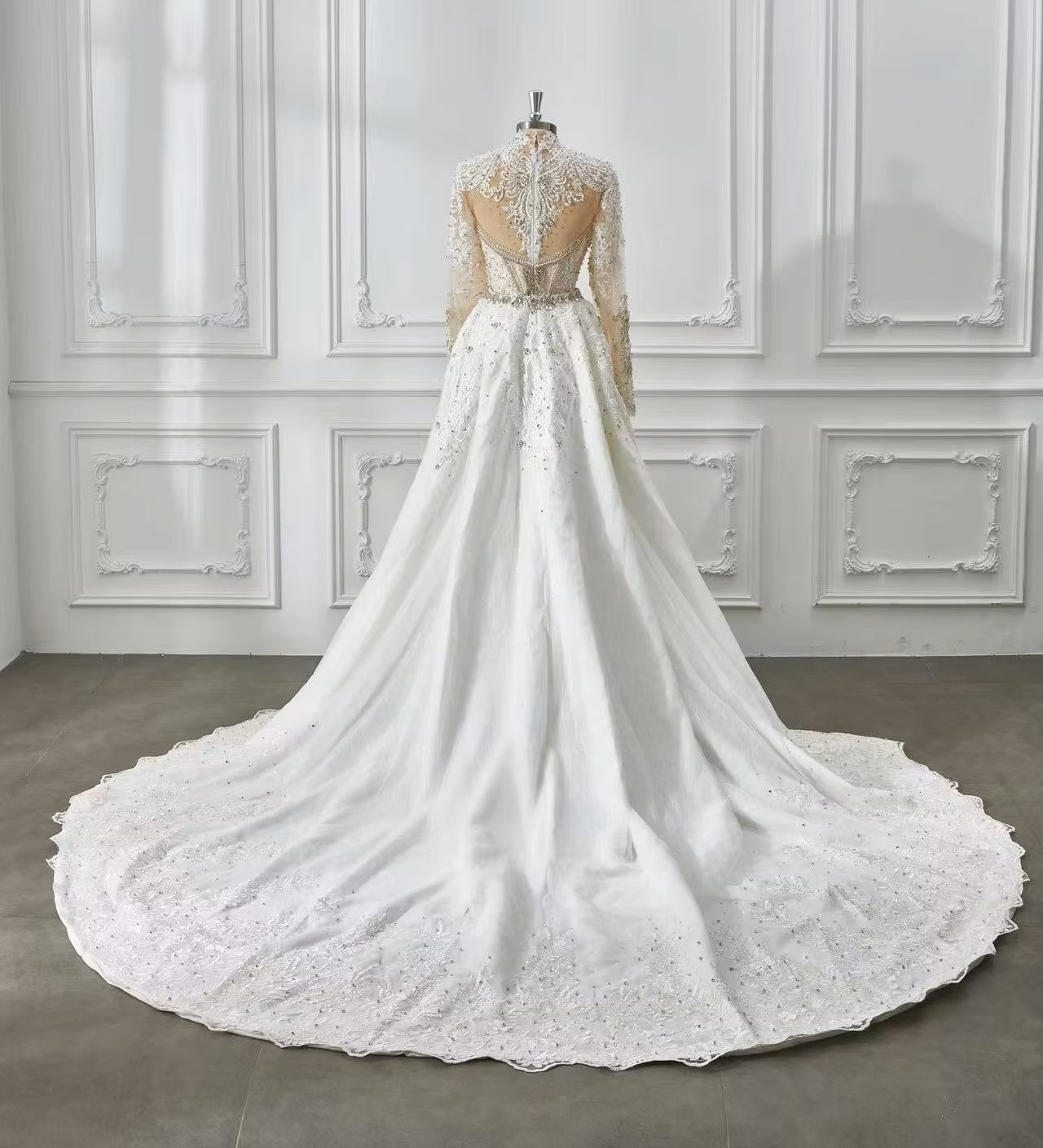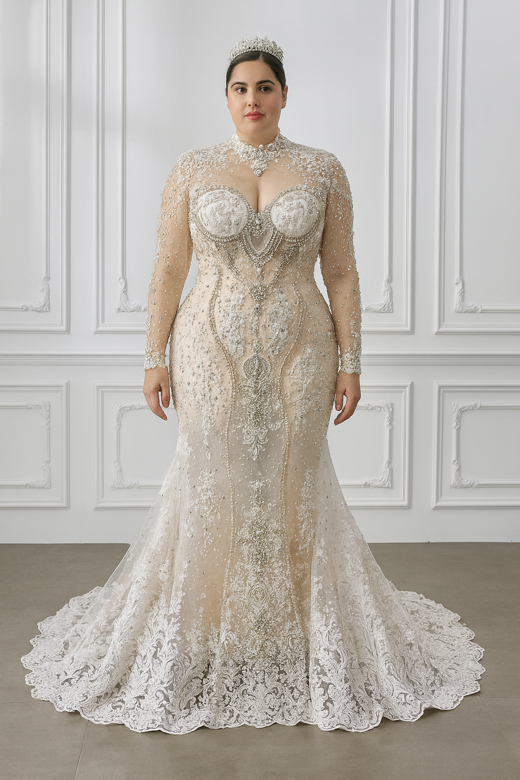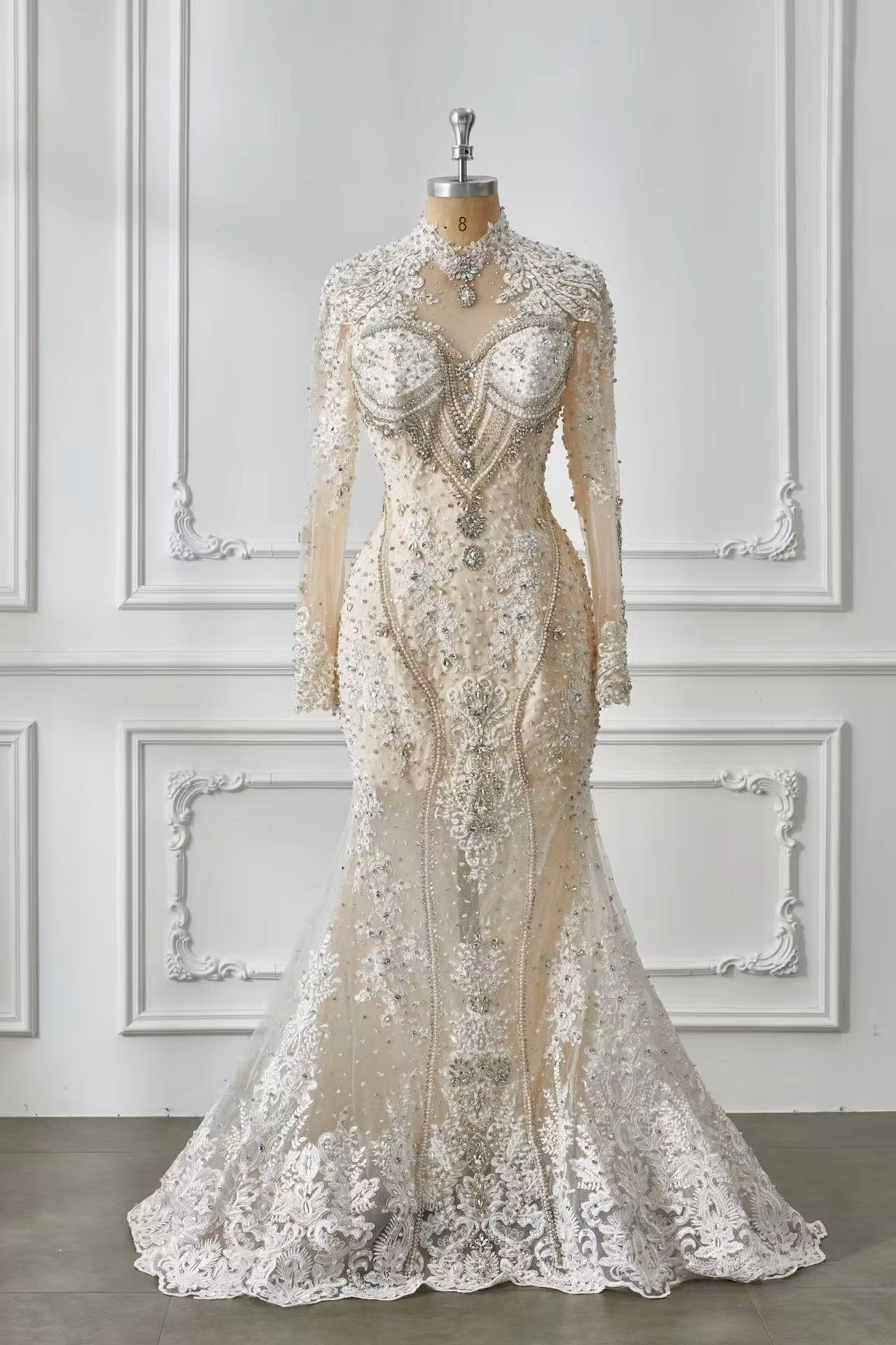 A breathtaking handmade couture gown featuring intricate crystal beading, sheer illusion sleeves, and a sculpted mermaid silhouette. Designed to highlight your curves with lavish detail and a dramatic lace train. Pure luxury for the bride who wants unforgettable glamour.