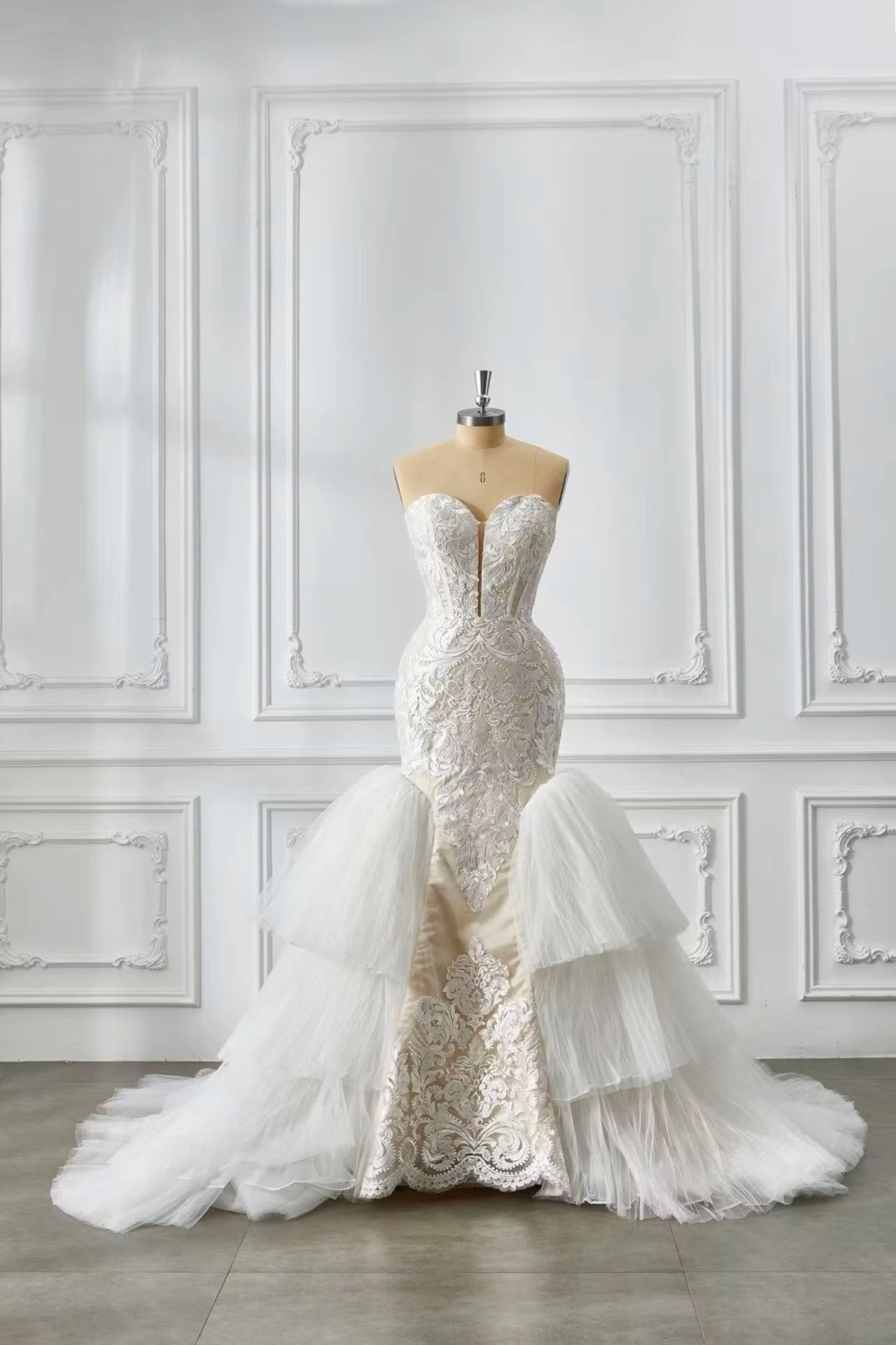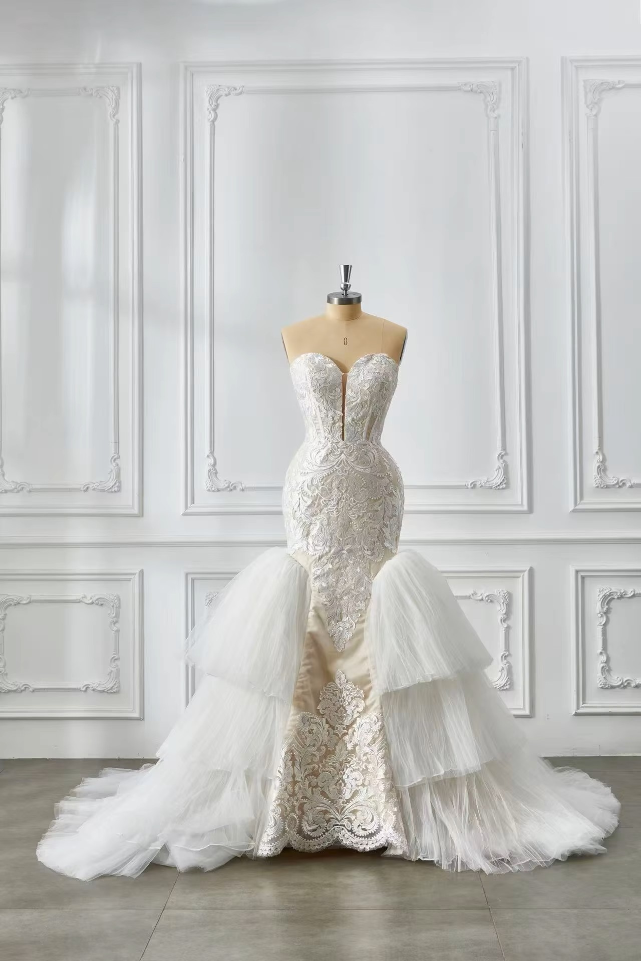 A sculpted mermaid wedding dress featuring intricate lace embroidery, a sweetheart neckline, and a dramatic layered tulle train. Designed to accentuate curves while delivering a romantic, couture-inspired finish from every angle.