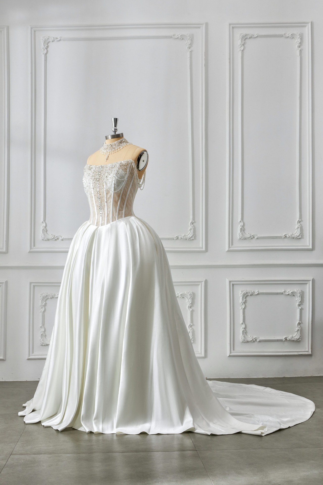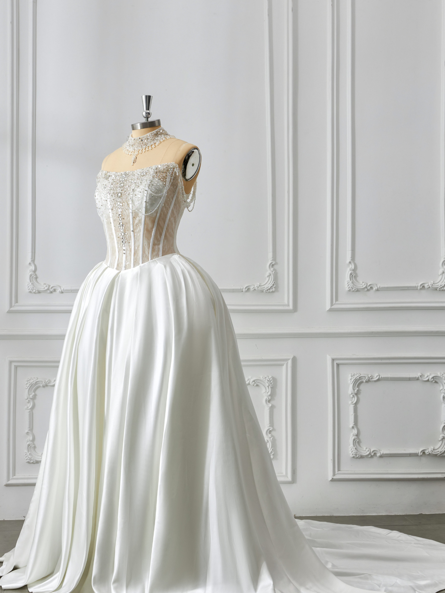 A stunning handmade gown featuring a crystal-embellished sheer corset bodice and a flowing satin skirt. Elegant, modern, and crafted for the bride who wants effortless glamour.