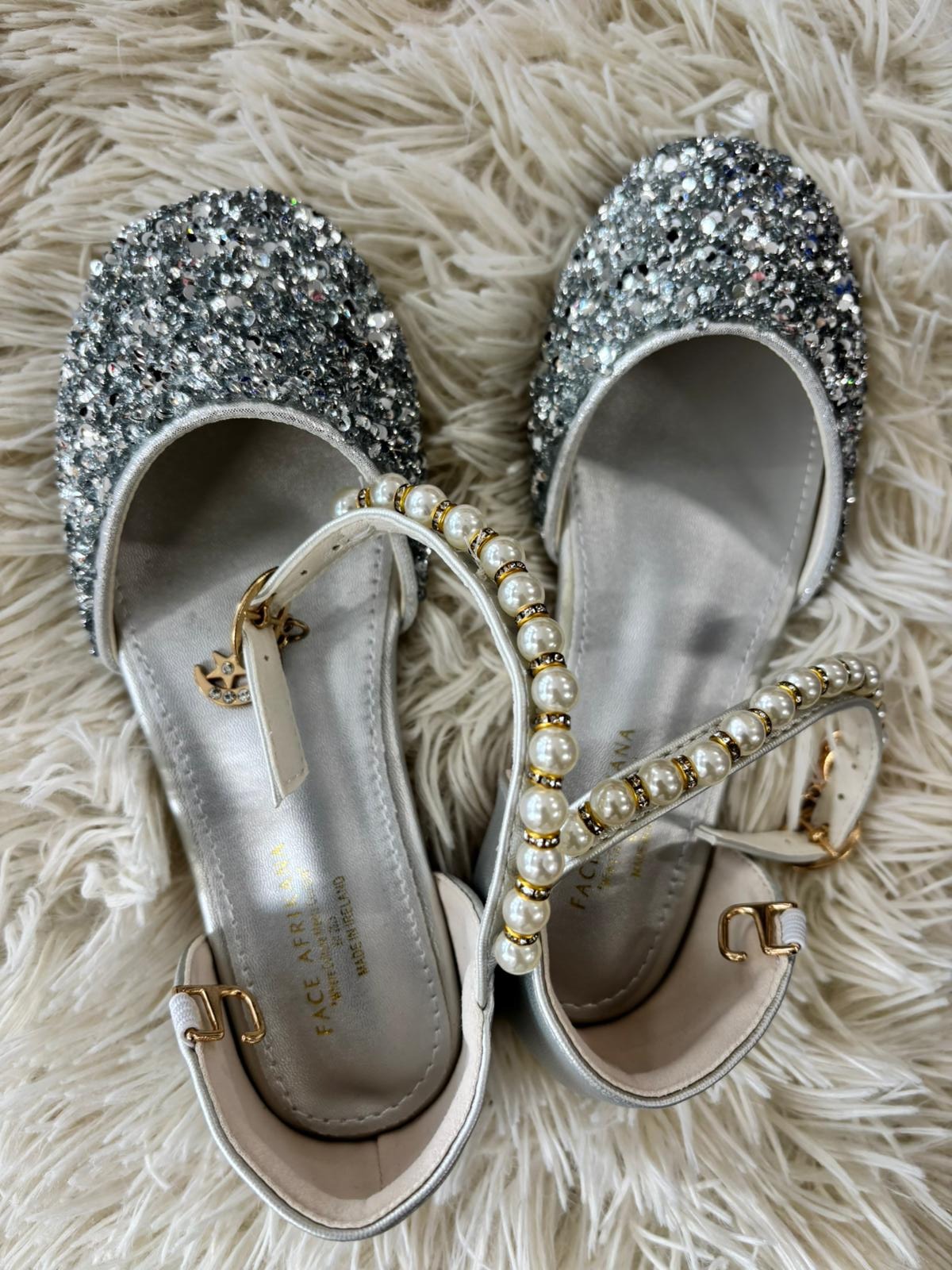 Elegant and eye-catching, these silver glitter sandals are designed with a sparkling finish and a delicate pearl-embellished strap for a touch of sophistication. Featuring a secure ankle fastening and soft inner sole, they’re perfect for parties, weddings, and special occasions.