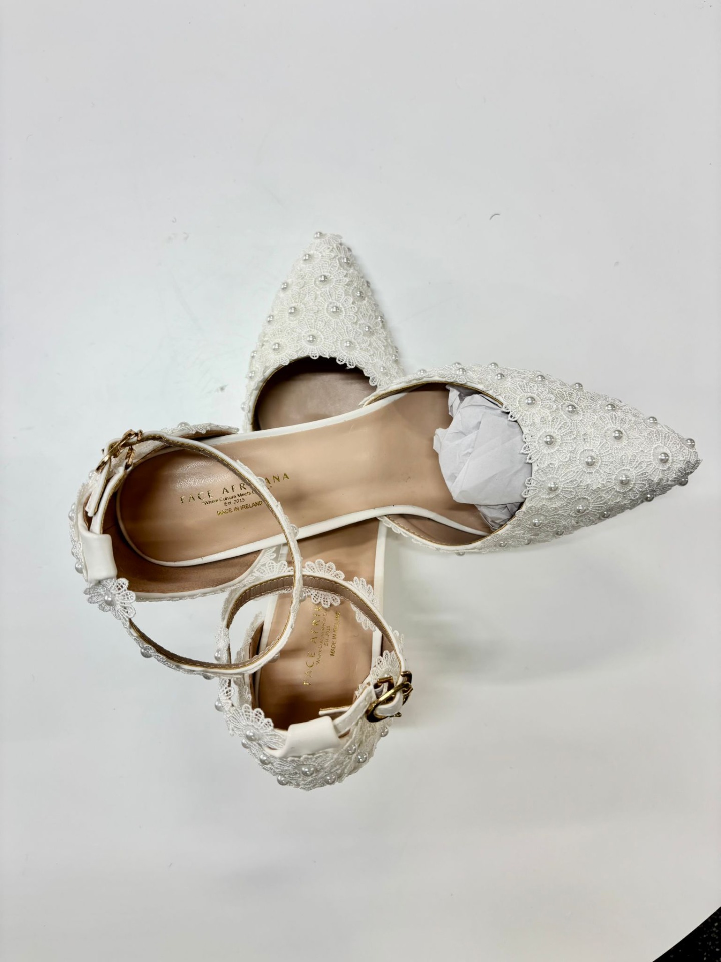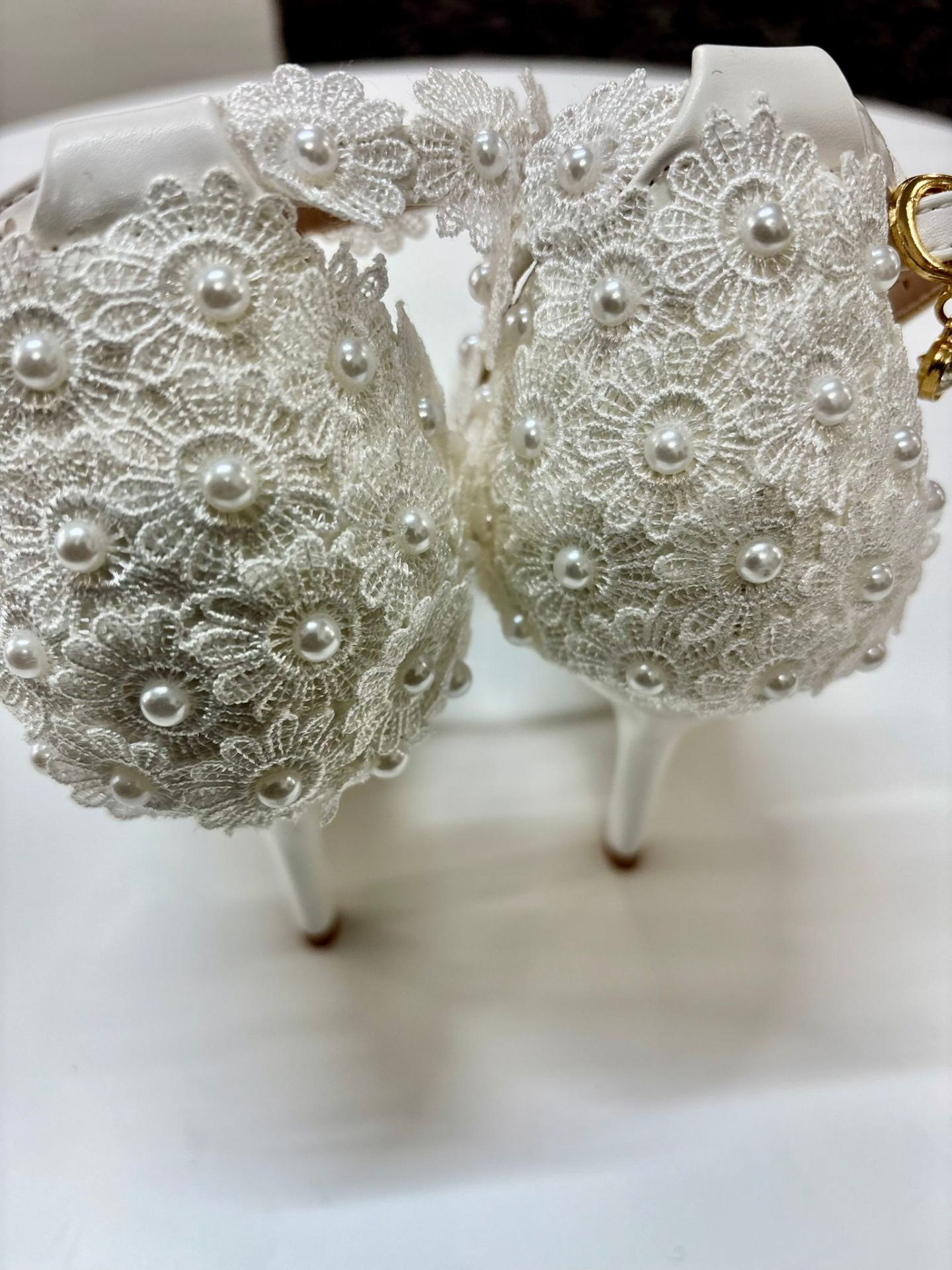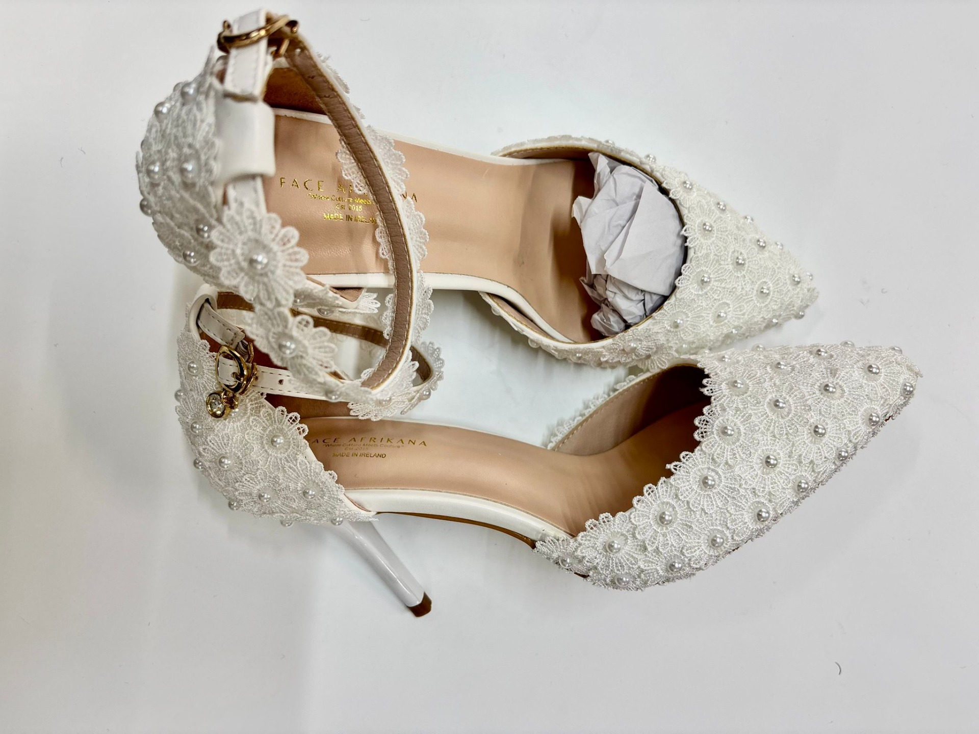 Elegant white heels with pearl-embellished lace and a pointed toe. Finished with an ankle strap for a secure, refined fit—perfect for weddings and special occasions.